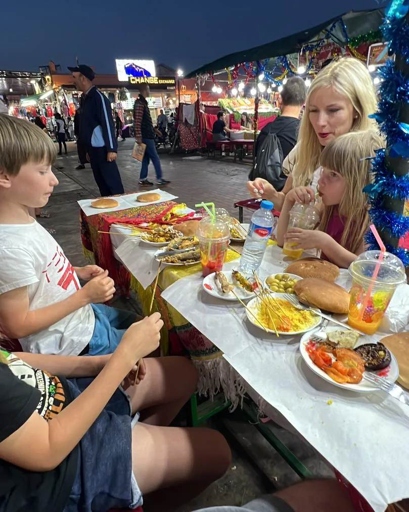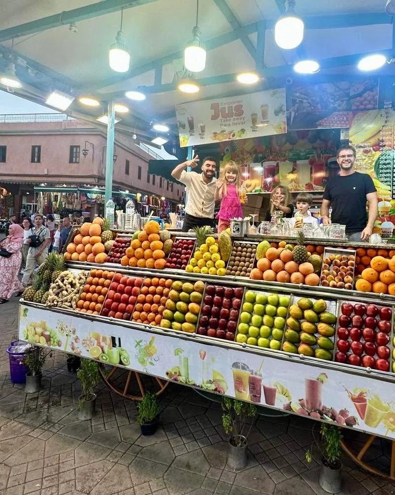 - kdyz mate stesti a trefite na hlavní namesti (Jama el fna), tak tam je snad cely orientální Svět😀 - čerstvé džusy z 20 druhů ovoce po 2 €, pečené masa ze vseho co znáte (nebo i nechcete znát), kytky, kabelky, skleněné veci, oblečení, krotitelé hadů, proste všechno.. Všechno je dobré a nemusíte se bát jist u stánků skoro cokoliv..