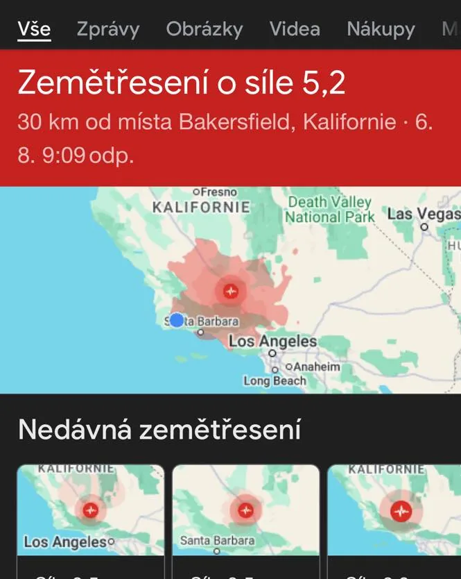 Očekávali jsme neočekávané,👉🏻 ale ze si projedeme i zemětřesením jsme nejak neuměli dohlédnout😳. To si jedete v noci po dalnici mezi LA a Santa Barbarou a najednou Vam začnou pipat vsechny telefony v aute - i ten, co nepoužíváte (což působilo jak z beckoveho hororu) a na vsech naskakovat nejaka zprava začínající: Warning.. Koukate po ostatních autech a jen jedno jedine zapne výstražné blinkry a trochu zpomalí. Btw. i tato notifikace dojde ve španělštině (jako všechno v anglicky mluvicich USA🤣). Bylo to divné, nevěděli jsme, jestli mame někam sjet, naštěstí kolem nebyly žádné vysoké budovy. Zrovna jsme mířili k nabíječce a tam potkali nejakeho Itala. Ptám se ho na to a on, ze to uz proběhlo. Ze volal synovi a ten to doma trochu citil. Tvrdil, ze epicentrum bylo 4 hod od nás ve vnitrozemí. Jak vidíte na obrázku tak bylo jen 30 km od nás.. Tak jsme poprvé v životě projeli autem i zemetresenim..🙈🙈