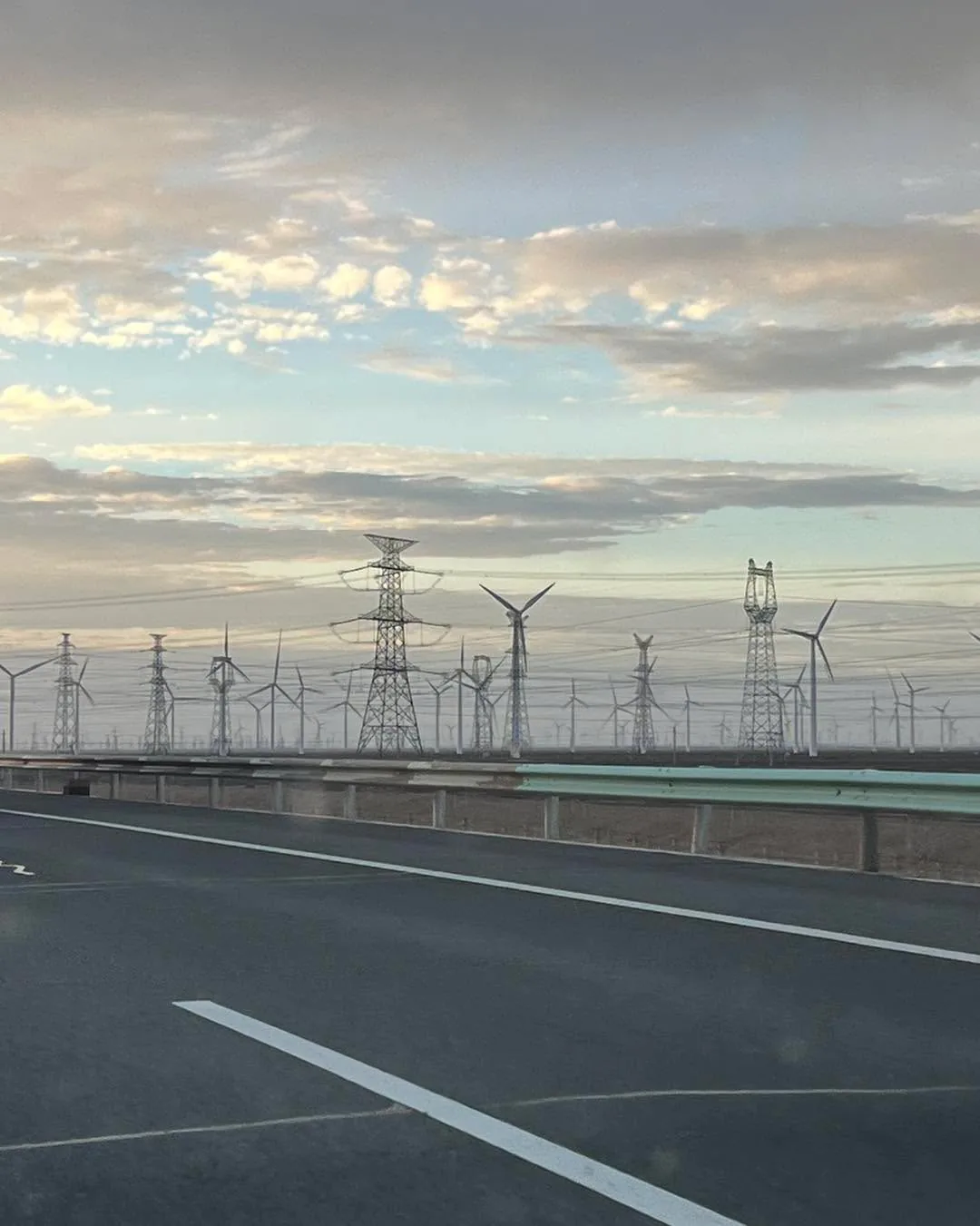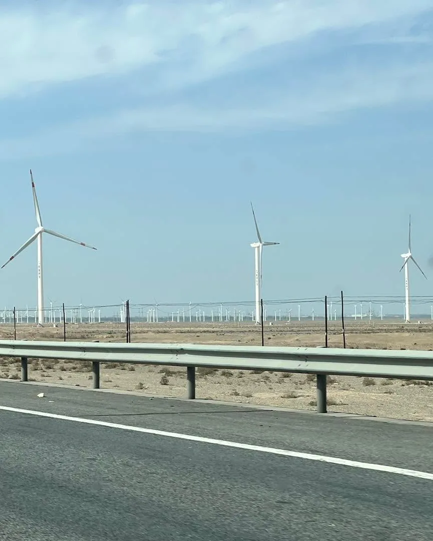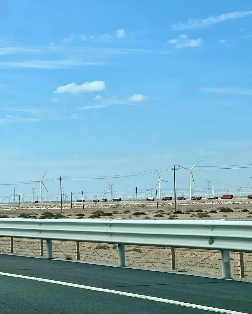 Jsou vidět ale velké investice do infrastruktury - ta dalnice, po které jedem napric celým serverem Ciny bude mit v součtu cca 4.000 km a její většina pred 20-ti lety nejspis neexistovala. Podél je videt železnice a skoro vsude obrovske vedeni silové elektřiny a spousty kilometrů solárních panelů a větrných parků - zacali jsme si to pro sebe nazývat: Industrializovaná poušť.