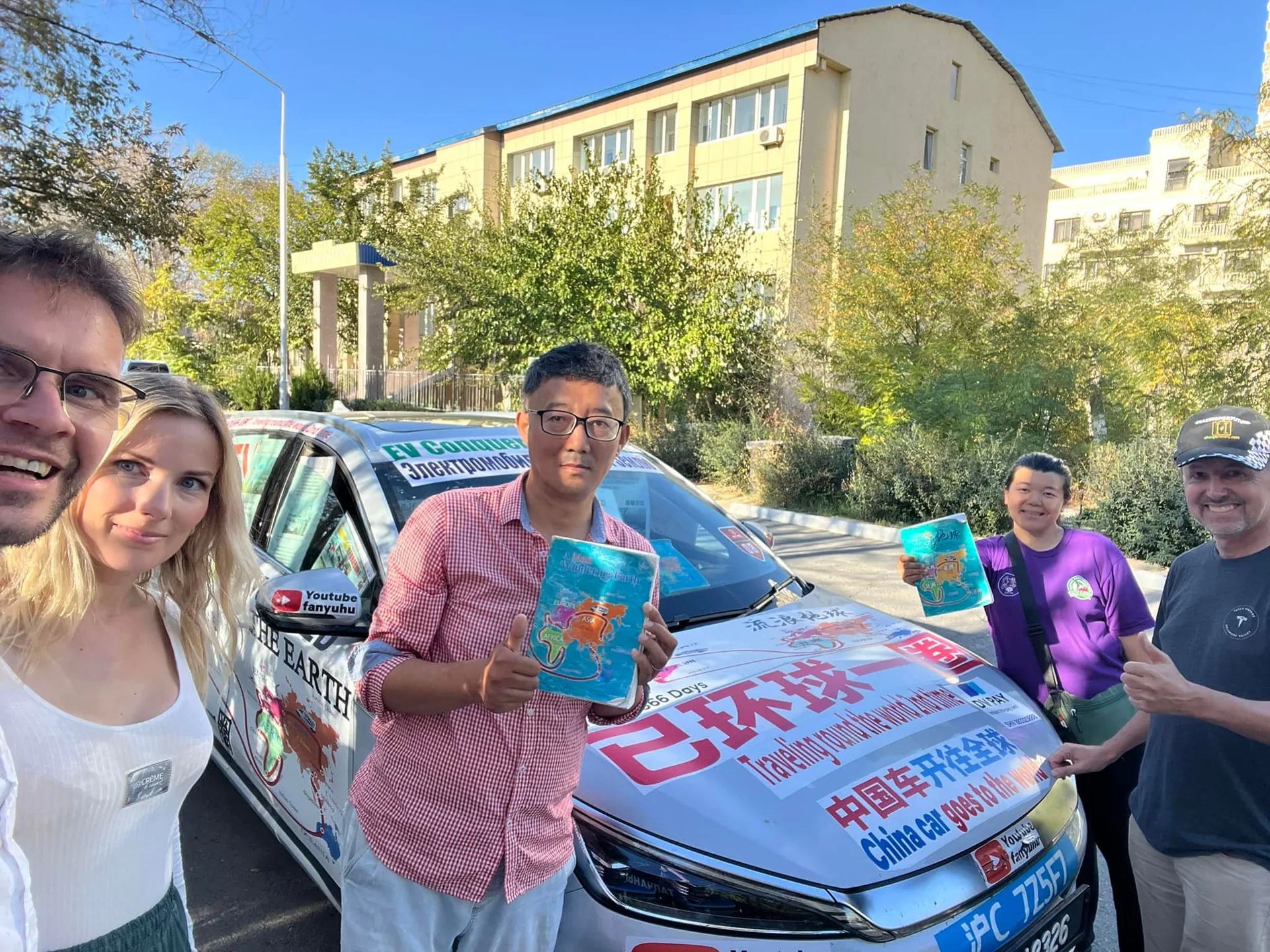 Lidé: O Fanyuhu a Glorii jsme věděli od Ciny.. Dokonce jsem v různých zemích pozadal 2 lidi o propojeni, takze jsem vedel, ze to jednou prijde😉. Dnes rano nam Aktan v Aktau poslal náhodnou fotku z ulice s jejich autem. Takze jsem jim hned napsal a poslal nasi polohu a oni prijeli za nami, protoze nase auta uz jsou na moři.. Za jejich cestou kolem světa je silnější příběh, nez jsem cekal. Vlastne jsou 2: